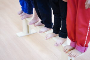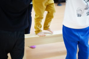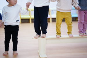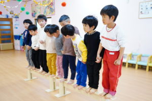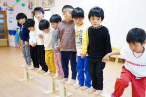 まずは「平均台」にのって横歩きしながらおともだちみんなにハイタッチしていきます🙌