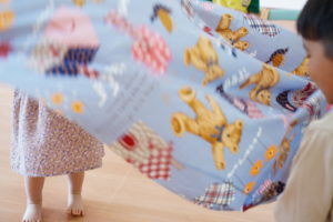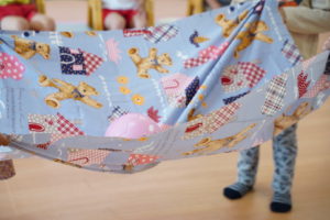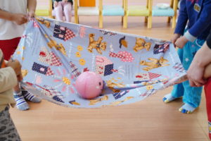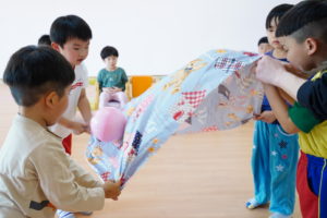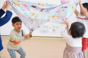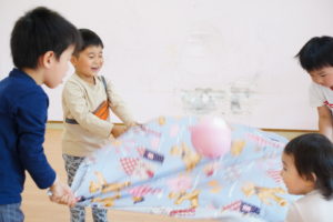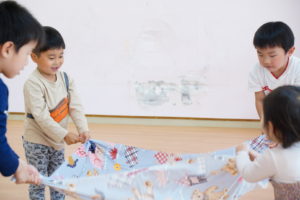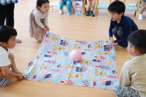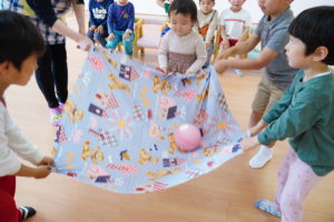 4人で布の端っこを持って上下に揺らします🌼