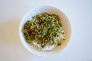 〈ひき肉とブロッコリーの甘みそ丼〉
