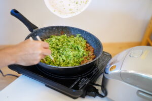 甘みそで味付けしたひき肉と炒めます🔥🔥