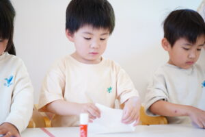 まず、机の上に折り紙・のり・お皿の3つがあるかな❔