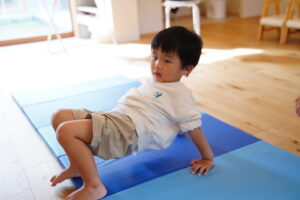 お山すわりをして手と足で踏ん張って