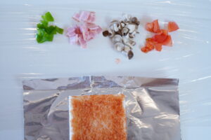 「ぼくが切ったベーコンたくさん乗せよう💚」
