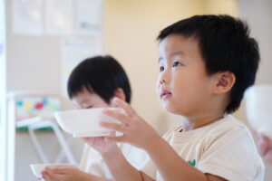 みんなはお皿を持って食べているかな?