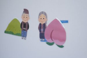 むかしむかし、あるところにおじいさんとおばあさんがいました。おじいさんは山へしばかりに、おばあさんは川で洗濯に行きました。ある日、おばあさんは川で大きな桃をひろい、家に持って帰りました。