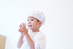 エプロンを着たら手を洗うだったね!