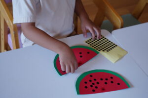 書かれた数字の数だけ、スイカの種を貼るシール貼りをしました🍉