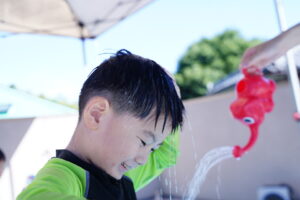 見学のお友達は足を水につけて