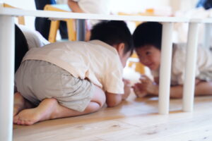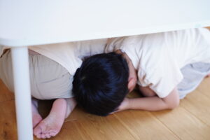 揺れがおさまるまで机の下で頭を守っていてね!