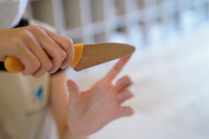 包丁をよく見て指を切らないようにゆっくり切ろう