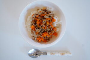 このニンジンとお肉を混ぜてご飯の上にのせると、、、