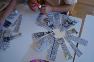 丸い画用紙に新聞紙を貼っていくよ!