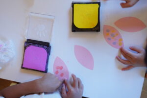 きのこの頭とふくろうの羽にスタンプで模様をつくろう✊🧡