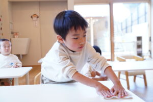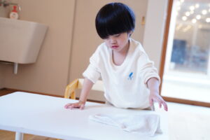 まずは、雑巾を使って机と椅子を綺麗にするよ!