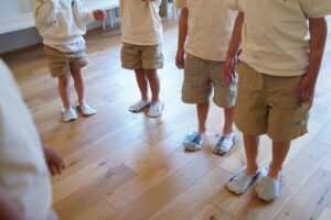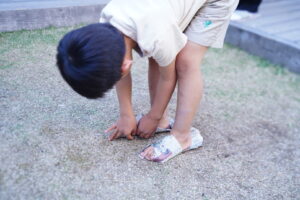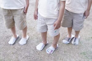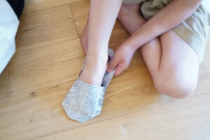 裸足は痛いけど、新聞紙のくつがあると痛くないね✨