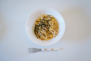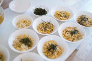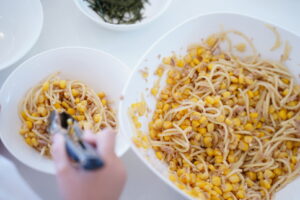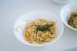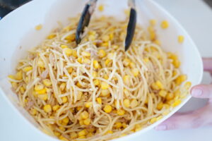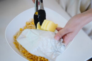 ①ボウルにツナ缶・コーン・バター・醤油を入れる