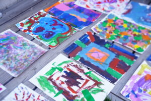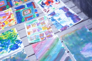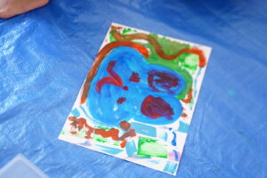 筆やローラー、スポンジ、毛糸、スクイージー(水切り)を使って、