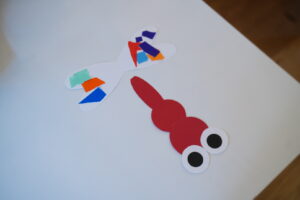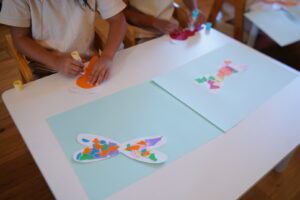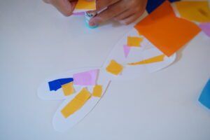 次はみんなが作ってくれた羽を画用紙に貼って
