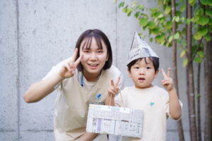 一緒に新聞紙でぼうしとかばんを作りました😊