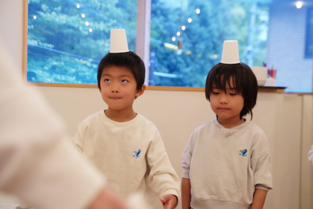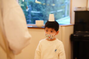 頭の上に紙コップをのせて落ちないようにあるくよ!