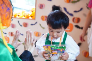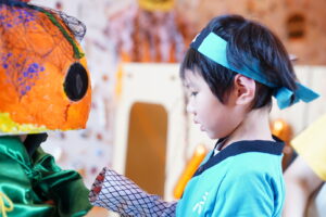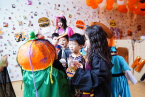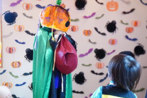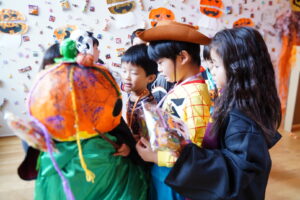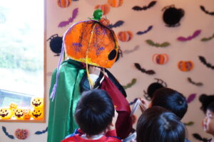 みんな~、かぼちゃおばけからお話があるみたい!