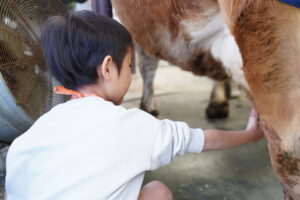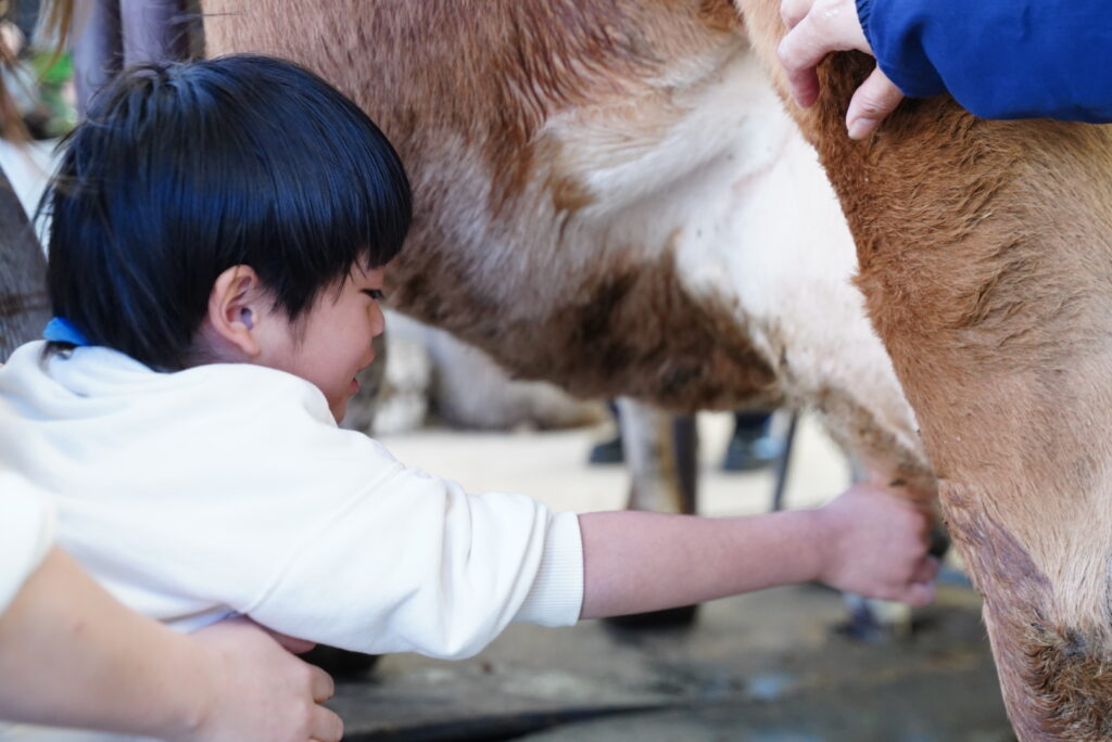 乳しぼりをして子どもたちは