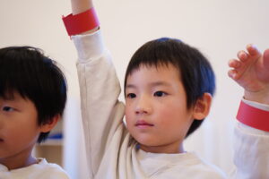 みんなは「みぎ~」って言いながら右手をあげるよ!