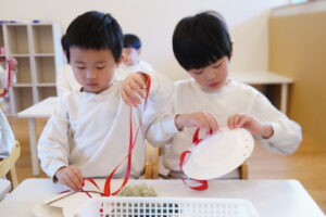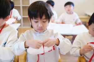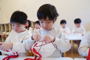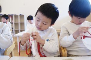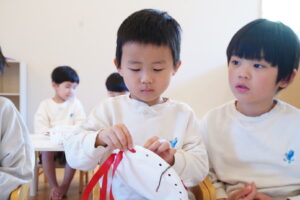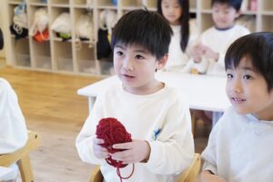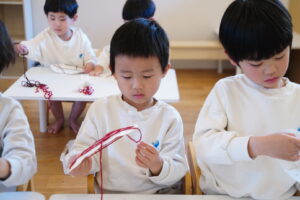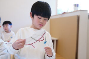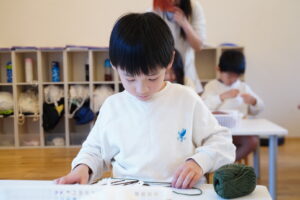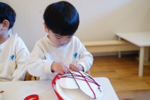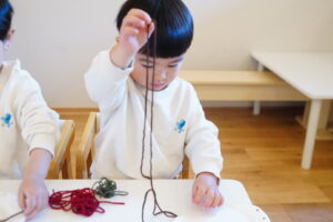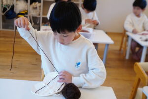 ・毛糸を引っかけたり、ひも通しするときは、かごの中に片付けよう