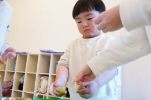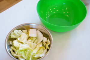 年中さん・年少さんは、手で白菜をちぎっていくよ~!