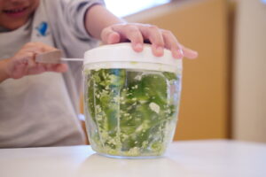 今日は、ブンブンチョッパーを使って、お野菜を小さくしていくよ!